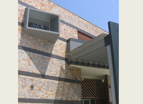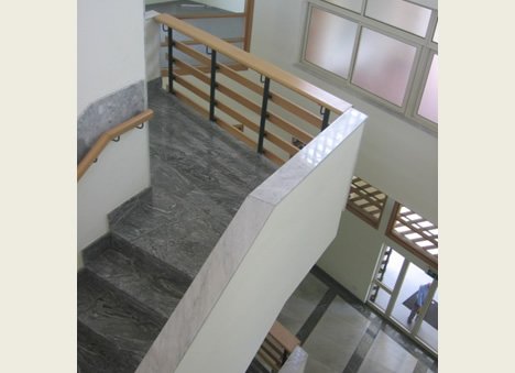 | This office building houses the office needs of Kunoch Ltd. The spatial requirements include Conference Room, Offices, Executive Offices, Dining Room, Board Room and Library. The building has a regular rectangular form with the exception of the entrance wall that is tilted at an angle. The main opening on this wall is an architectural feature that gives a view from the Chief Executives’ Office to the exterior. This elevation is finished in stone rubble and black tiles. |